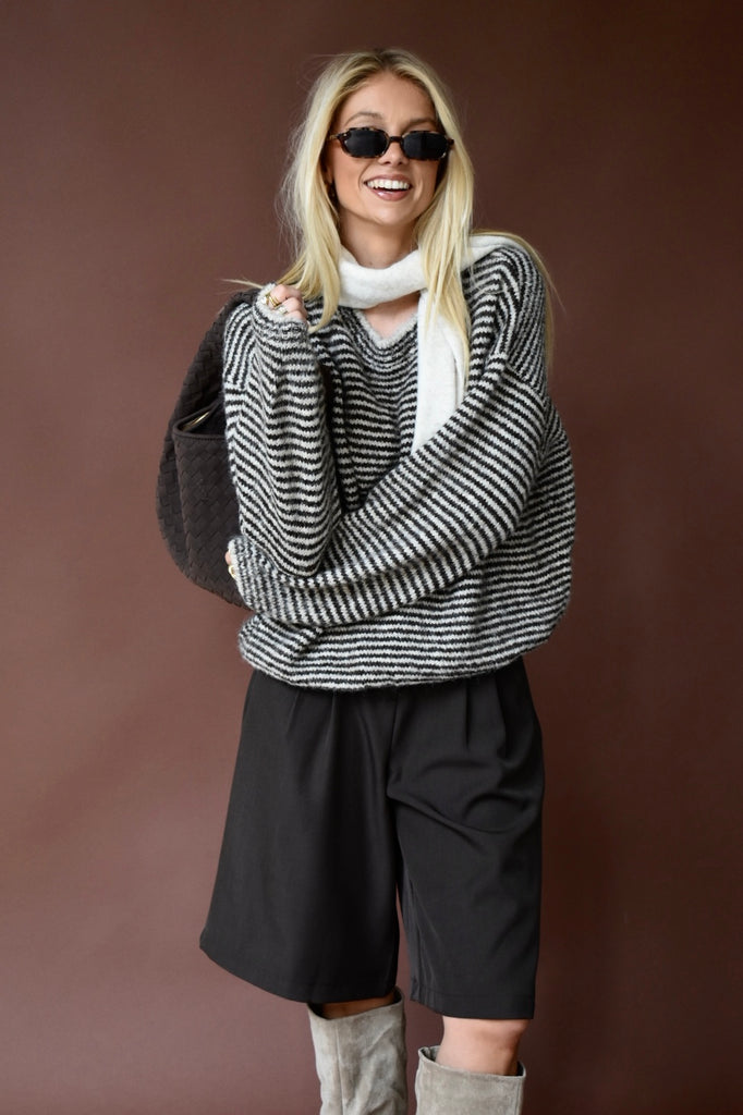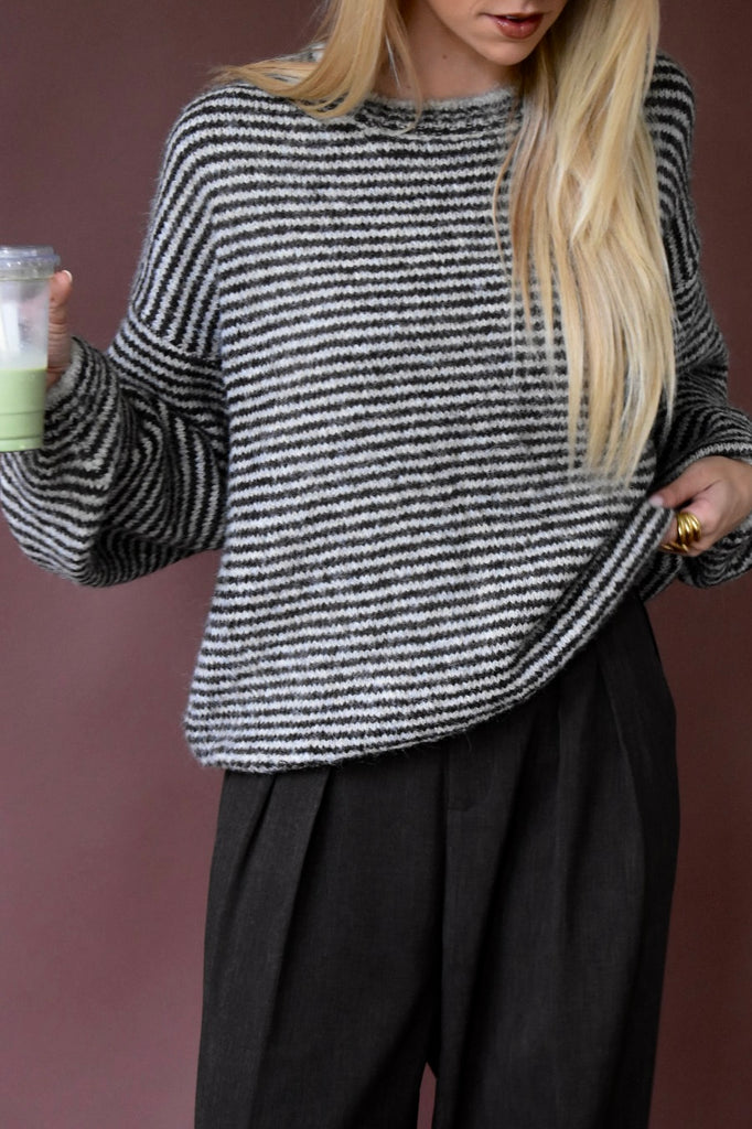 Maak kennis met de trui die je deze herfst en winter niet meer uit wil doen! Deze gestreepte oversized trui is de perfecte combinatie van comfy en chic. De zachte, neutrale kleuren geven een warme uitstraling en zijn eindeloos te stylen...van casual met je favoriete denim tot classy met een pantalon.