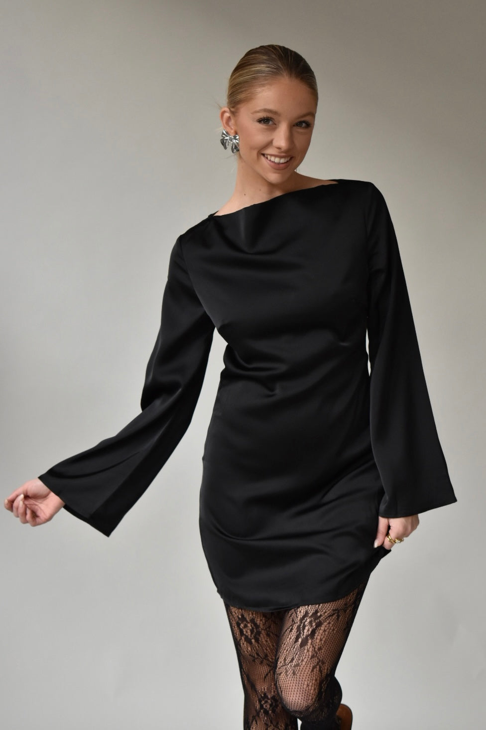 Onze little black dress is een echte beauty! De jurk is gemaakt van een fijne, satijnachtige stof en heeft een chique uitstraling door de lange mouwen en de openrug detail. Combineer het jurkje met een hakje en je favoriete sieraden en accessoires voor de ultieme look! Wees er snel bij en shop meiden!