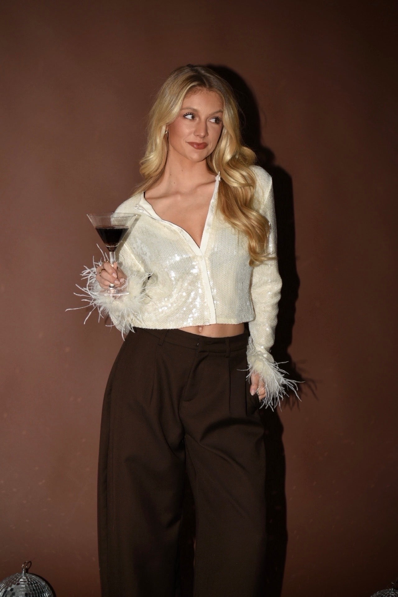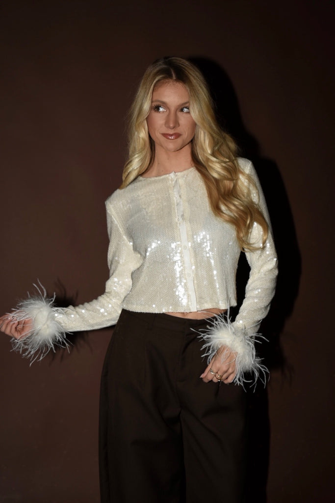 Say hi to this beauty! Onze sequin feather top is dé musthave van het party seizoen! De top heeft super leuke details zowals de veren, glitters en knoopjes. Draag de top op een leuke jeans of kies voor een nette pantalon voor een avondje uit met hakken en sieraden. We are obsessed!